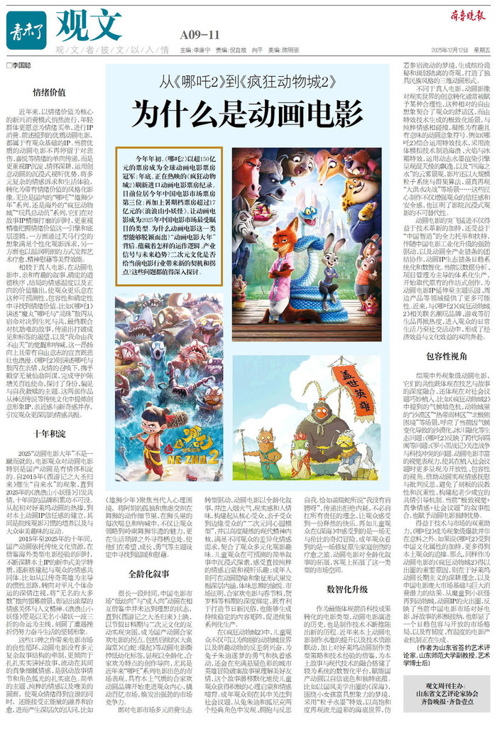今年年初,《哪吒2》以超150亿元的票房成为全球动画电影票房冠军;年底,正在热映的《疯狂动物城2》刷新进口动画电影票房纪录,目前位居今年中国电影市场票房第三位;再加上暑期档票房超过17亿元的《浪浪山小妖怪》,让动画电影成为2025年中国电影市场最受瞩目的类型。